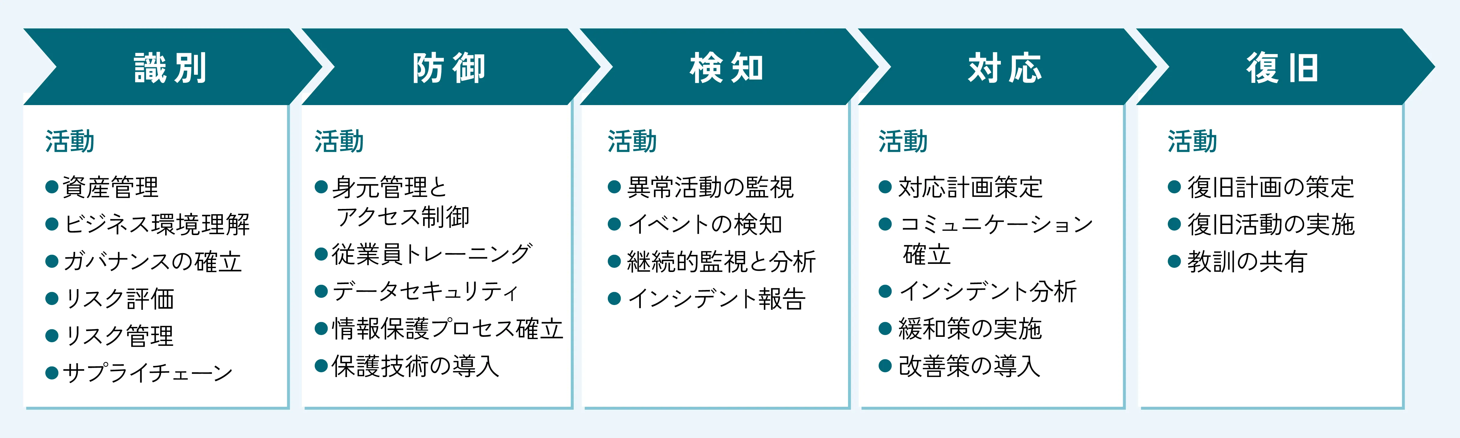 組織はこのフレームワークを参照することで、自社のセキュリティ対策を体系的に点検でき、成熟度や不足している分野を明確にできます。