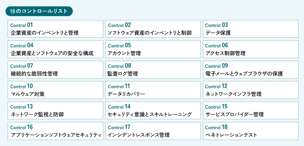 例えば、下図の18のコントロールリストでは、「企業資産のインベントリと管理」「アカウント管理」「継続的な脆弱性管理」「ネットワークインフラ管理」などが記載され、すぐに実行できる具体策が明示されています。これは、NIST CSFのようなフレームワークを実装するにあたり「現場でどの対策から始めるか」を検討する上で補完的に機能する関係にあります。