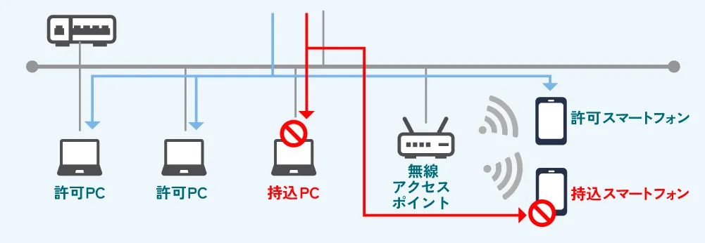 その理由はシンプルです。社内ネットワークに「把握していない機器」や「許可されていない機器」が存在すると、それだけで深刻なリスクとなり、どれほど高度なセキュリティ対策を導入しても効果を発揮できなくなるからです。例えば、持込PCや持込スマートフォンといった管理外の機器が接続されている場合、次のような問題が発生します。