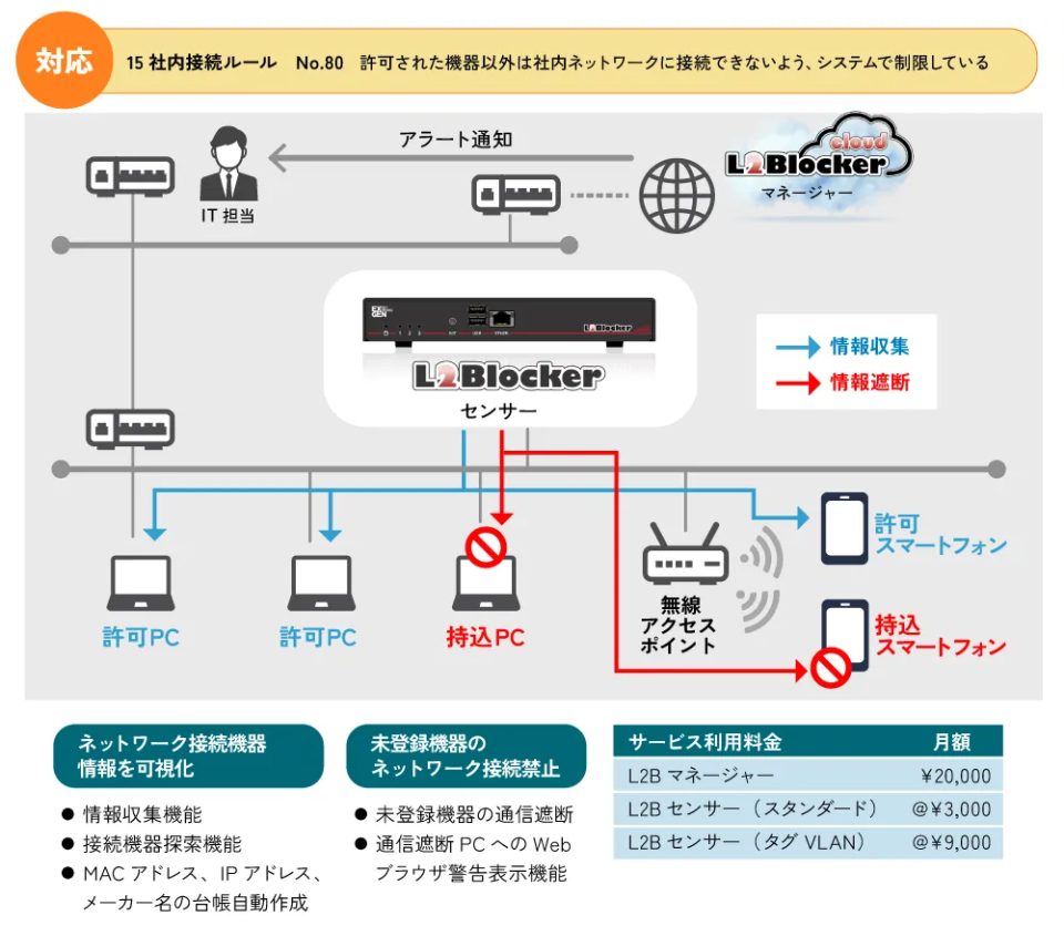 ラベル「15 社内接続ルール」の1つに、「許可された機器以外は社内ネットワークに接続できないよう、システムで制限している」という達成条件があります。 この達成条件をクリアするためには、未許可機器の接続を制限するための仕組みを構築する必要があります。これを低コストで実現するのが、クラウドサービス「L2Blocker」です。社内ネットワークの構成を変更することなく、「後付け可能なセンサー」を設置するだけで、未許可の機器がネットワークへ接続されるのを防ぐことができます。