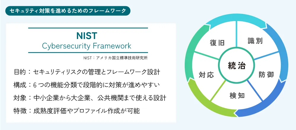 セキュリティフレームワークの代表例が、アメリカ国立標準技術研究所(NIST)が策定した NIST Cybersecurity Framework(CSF)です。