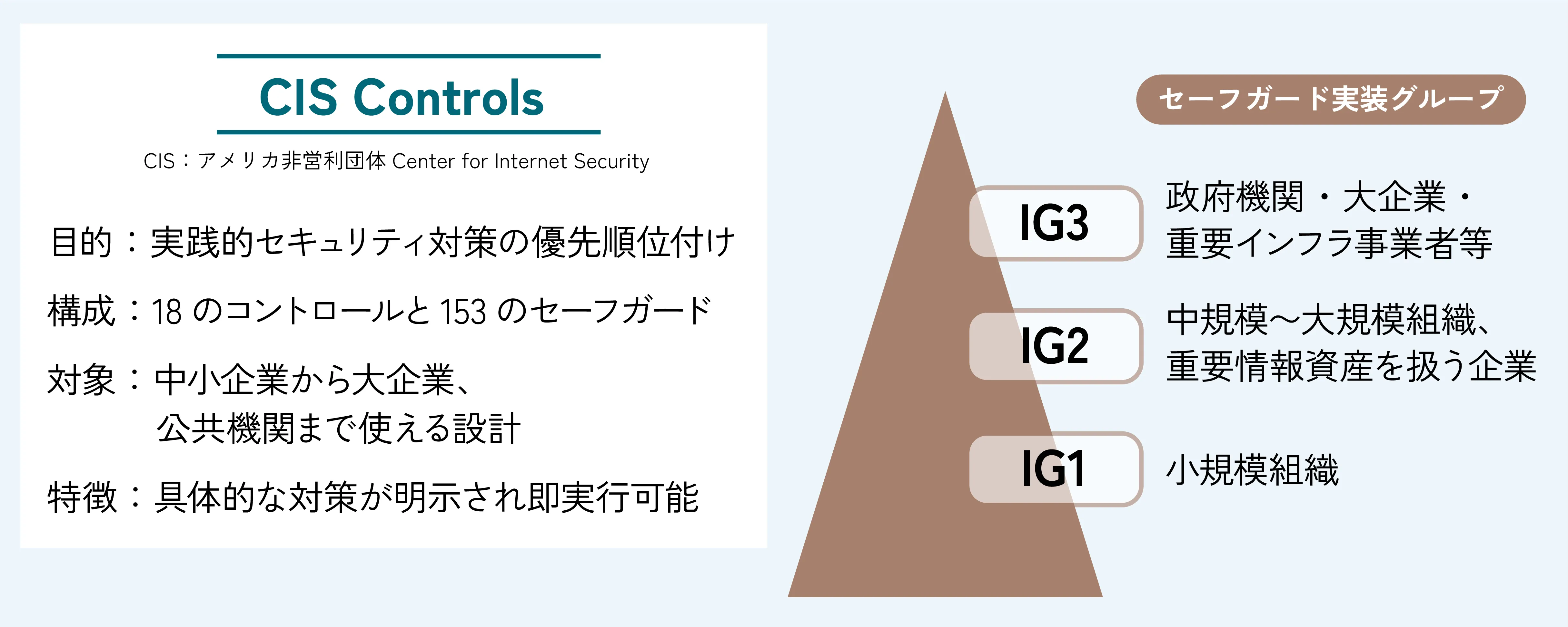 次に紹介するのが、米国の非営利団体 CIS(Center for Internet Security)が公開しているCIS Controlsです。CIS Controlsの目的は「実践的セキュリティ対策の優先順位付け」です。組織の規模や扱う情報資産の重要度に応じてレベルが分けられ、対策の優先度が明確に整理されている点が特徴です。