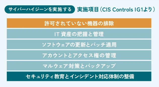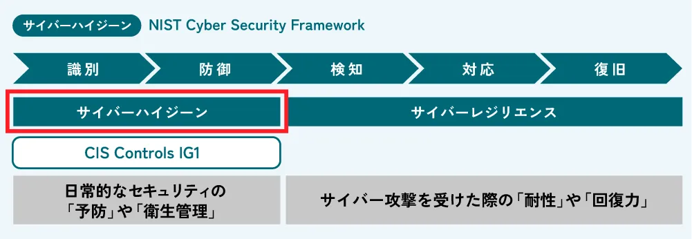 サイバーハイジーンは、セキュリティ人材や予算が限られている組織でも、低コストで実践できる点が大きなメリットです。これらは CIS ControlsのIG1(実装グループ1:小規模組織向けの必須対策) にも含まれていますので、参考にしてみてはいかがでしょうか。