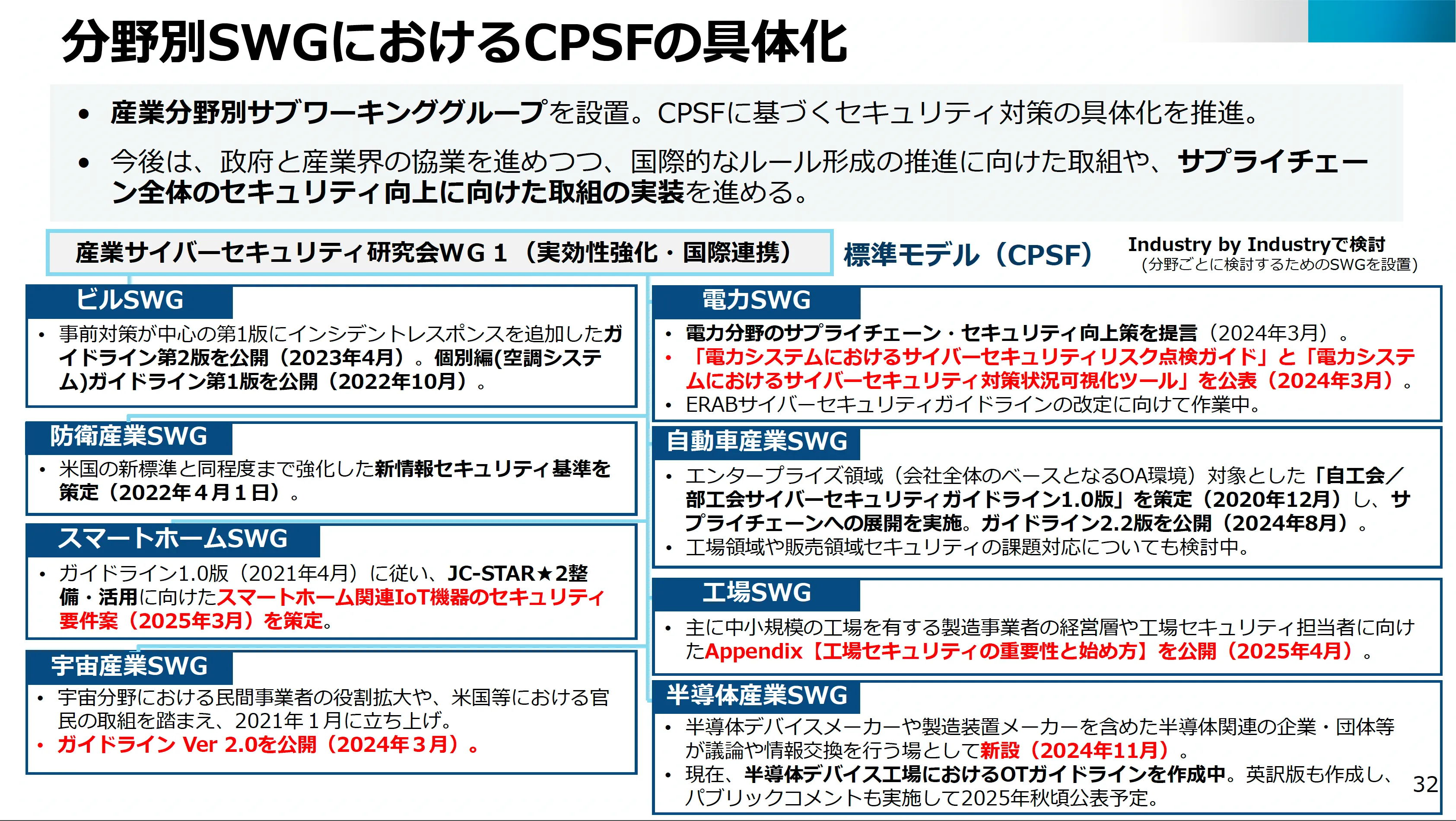 具体的には、自動車産業(自工会/部工会のサプライチェーン指針)、電力(サイバーセキュリティリスク点検ガイド、2024年3月公表)、工場(工場システムにおけるサイバー・フィジカル・セキュリティ対策ガイドライン、2025年4月公表)といった分野でガイドラインが策定・改訂されています。さらに医療、半導体産業、宇宙産業、スマートホームなど幅広い分野でも検討が進んでいます。