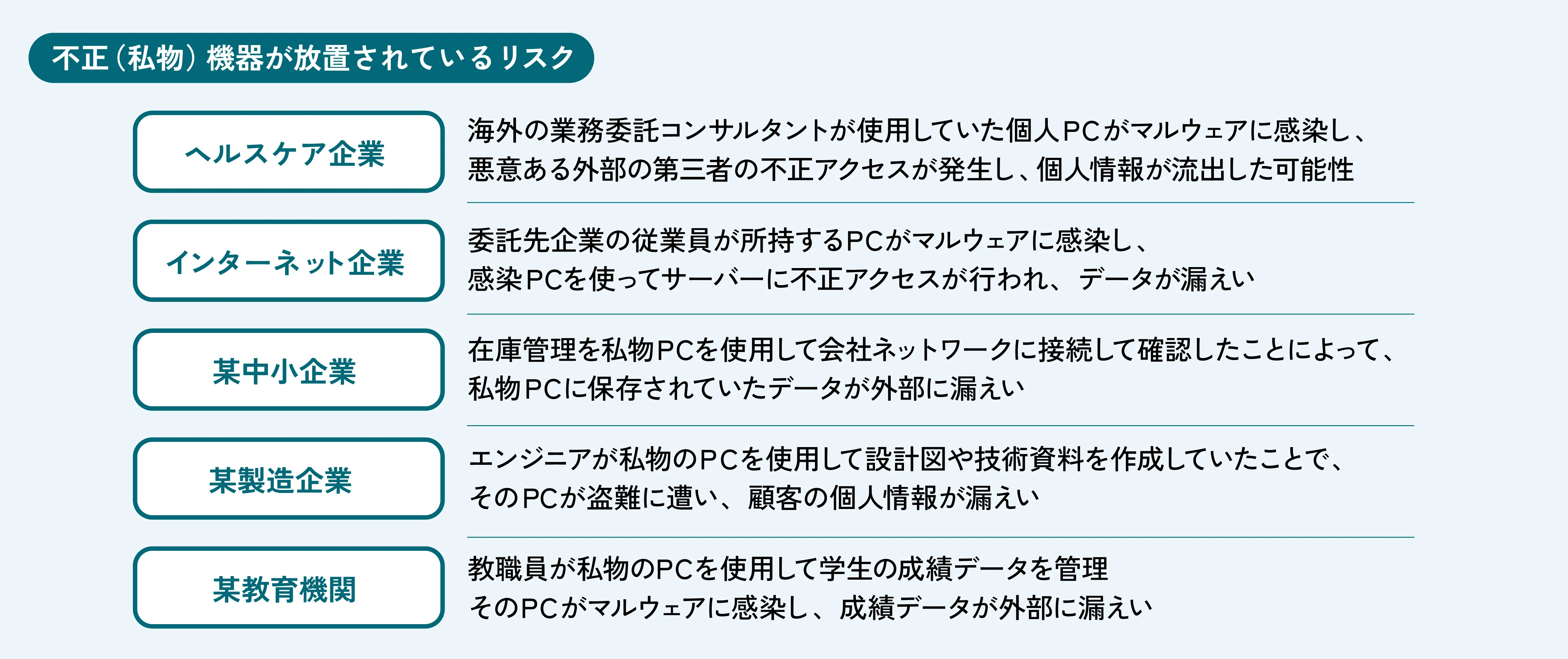 実際に、不正機器が原因でマルウェア感染や情報漏えいにつながった事例は、ヘルスケア・製造業・教育機関などあらゆる業界で報告されています。