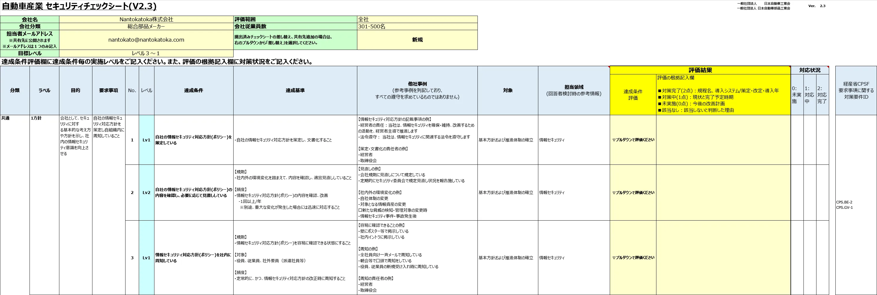 さらに、自動車メーカーやサプライチェーンを構成する企業には、サイバーセキュリティガイドラインに基づいて自己評価チェックシートを作成し、提出することが求められています。評価レベルはレベル1が最低限の対策(中小企業向け)、レベル2が標準的な対策(中小企業向け)、レベル3が高度な対策(大企業・メーカー向け)になっており、企業は自社の状況に応じて目標レベルを選択し、達成状況を評価する必要があります。