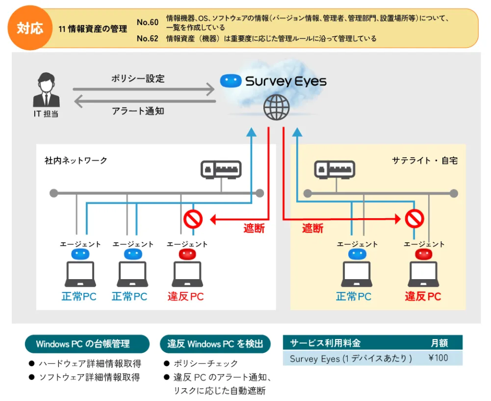 この達成条件をクリアするためには、常に最新のIT資産管理一覧(台帳)を用意することや、ルールを策定しそれに基づいた運用が求められます。その際に役立つのが、Windows PCの情報を一覧化しポリシーチェックを行うクラウドサービス「Survey Eyes」です。このサービスの活用により、低コストでWindows PCの一覧化やポリシー不備・違反対策が実現します。